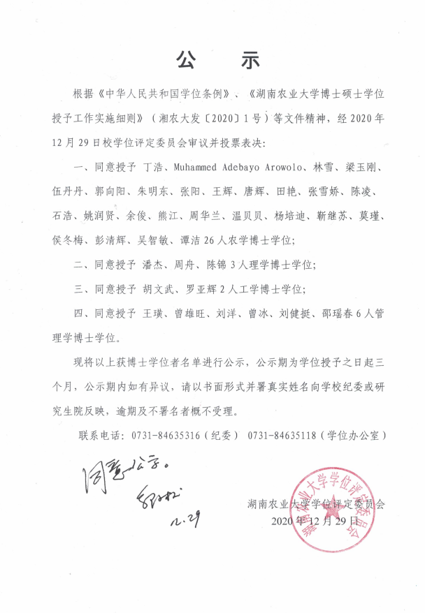 湖南农业大学2020年12月授予博士学位人员名单公示